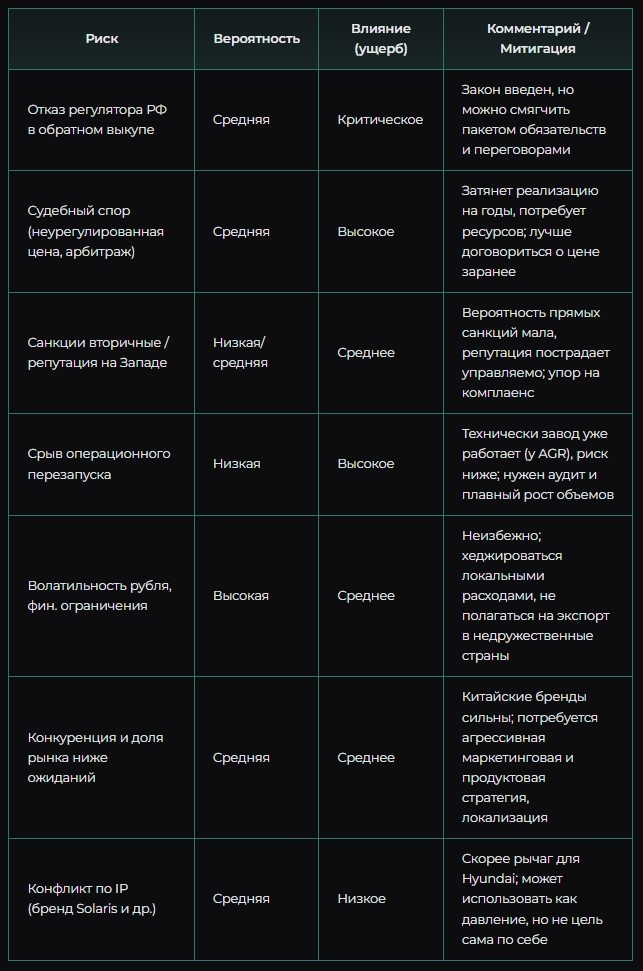 - Регуляторно-политические риски (Россия): возможность отказа российских властей согласовать обратный выкуп или выдвижение обременительных условий. Это включает уже упомянутый закон о блокировке опционов, а также требования правкомиссии. Митигировать: вести заблаговременный диалог с профильными органами (Минпромторг, правкомиссия), не дожидаясь конца 2025 г.; предложить пакет инвестиционных обязательств и социальных гарантий, который сделает сделку политически приемлемой (сохранение рабочих мест, новые вложения, локализация). Чем более прозрачным и выгодным для региона будет план Hyundai, тем выше шанс одобрения. Вполне вероятно, что для успешного возвращения потребуется неформальная поддержка на высоком уровне — переговоры должны учитывать интересы государства (например, готовность делиться технологиями, локализовать R& D, участвовать в соцпроектах Санкт-Петербурга и т. п.).