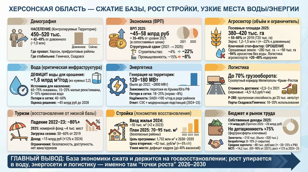 Херсонская область переживает структурную трансформацию экономики на фоне геополитических изменений и последствий боевых действий. Регион интегрирован в правовое и бюджетное поле Российской Федерации, однако экономическая активность существенно зависит от федеральных вливаний и безопасности. Ниже приведены 10 ключевых выводов (с количественными оценками):