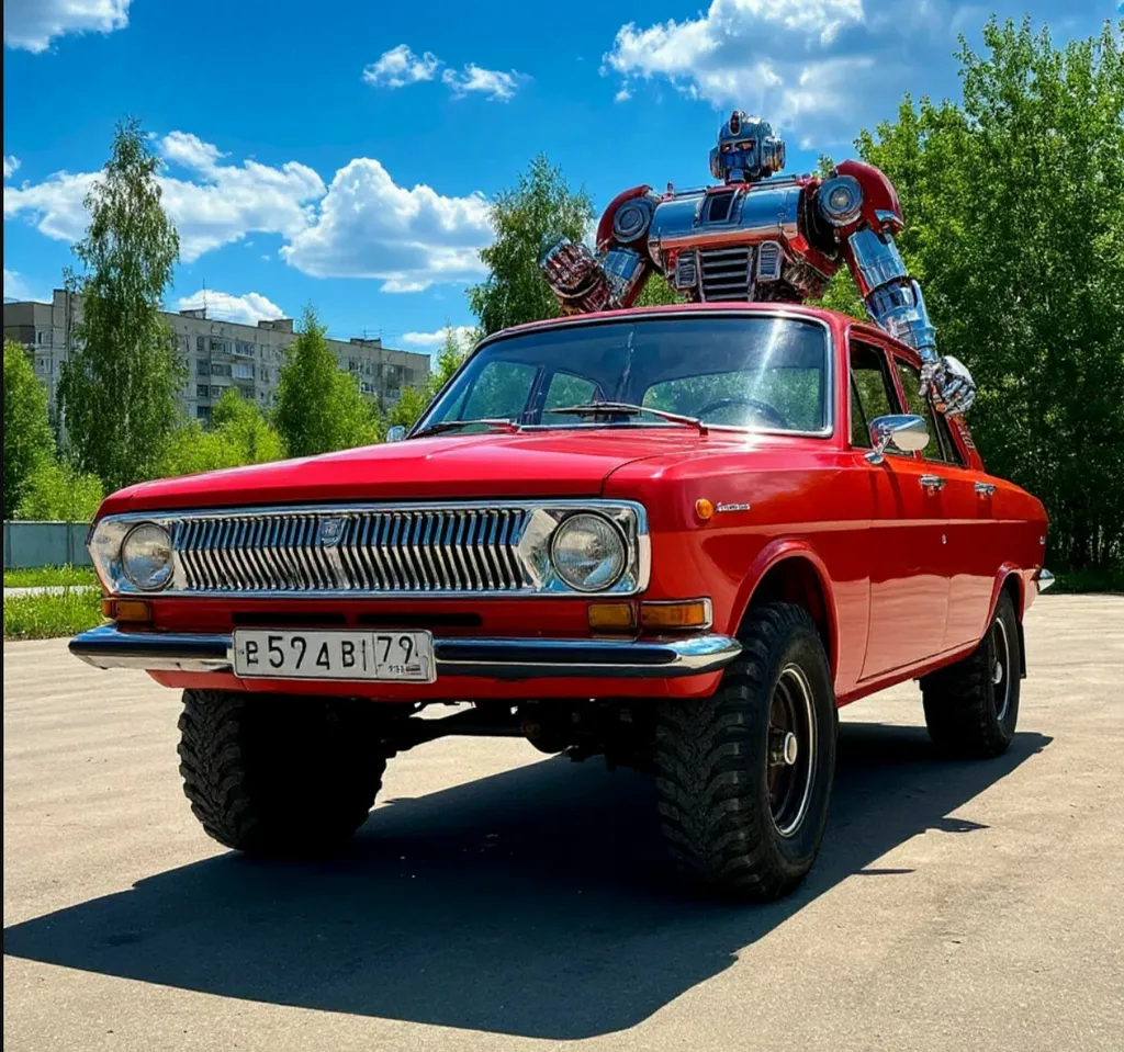 Роман вышел из салона и подошел к друзьям, которые с удовлетворением и радостью за товарища смотрели на ожившего зверя. Вдруг, ровный рев мотора сменился хаотичным наборов звуков подгазовки, клаксона. Они сопровождались таким же хаотичным мерцанием фар, внутреннего освещения, включением салонной вентиляции, искрами из под капота. Дальнейшие события с трудом поддаются описанию. Никто из мужчин ранее не видел ничего подобного. Никто из них не знал, что такое трансформер, но это был именно он. Неожиданно для всех волга превратилась из транспортного средства в трехметровую конструкцию, напоминающую персонажа фантастических романов.