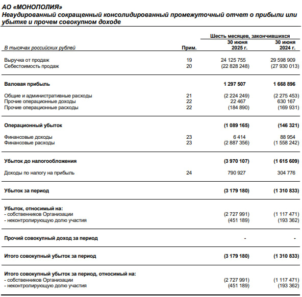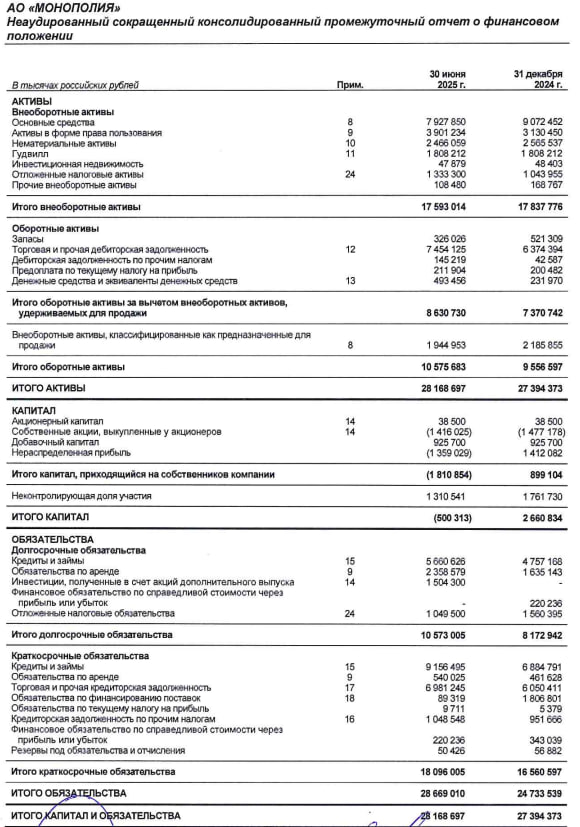В поисках ответа открываю последнюю отчетность «Монополии» за 2 квартал 2025 г. и вижу картину полного разгрома: капитал — минус 1,8 млрд руб, чистый долг — 14,3 млрд руб, убыток за 1 полугодие — 2,7 млрд руб.