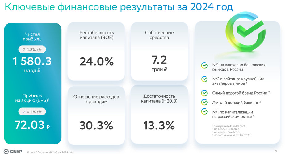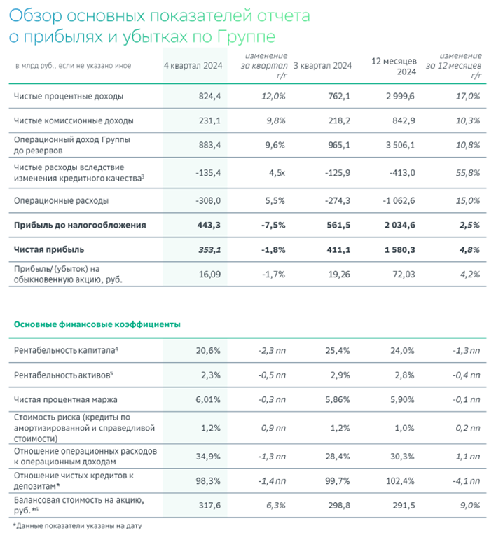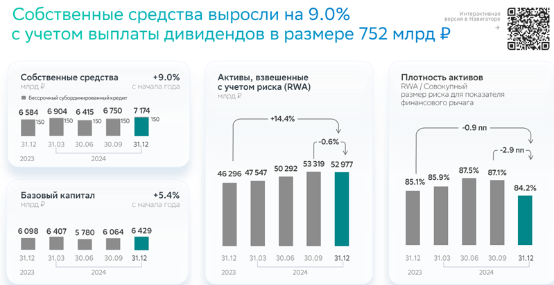 Чистая прибыль — 1,58 трлн руб или 72 руб на акцию (+4,8% к прошлому году). Собственный капитал — 7,2 трлн руб. или 318 руб на акцию. Рентабельность капитала — 24%.