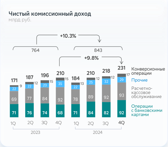 Чистый комиссионный доход, не зависящий напрямую от ставок, равен 843 млрд руб (+10,3%).