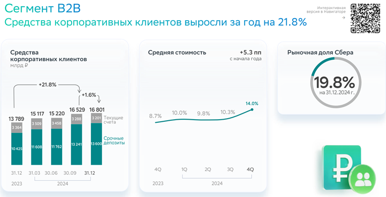 Средства юридических лиц составляют 16,8 трлн руб (+21,8%). Средняя стоимость сильно подросла — 14%.