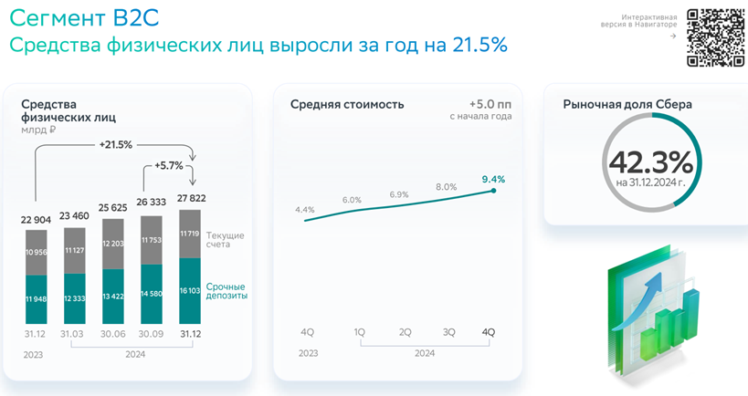 Средства физических лиц равняются 27,8 трлн руб (+21,5%). Средняя стоимость также подскочила значительно — 9,4%, оставаясь ниже за счет бесплатных остатков на картсчетах.