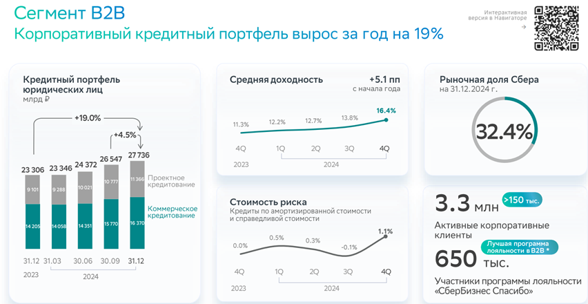 Кредитный портфель юридических лиц достиг 27,7 трлн руб (+19%). Темпы роста в 4 квартале в соответствии с пожеланиями ЦБ РФ снизились до 4,5%. 70,8% портфеля обслуживаются по плавающим ставкам. Средняя доходность– 16,4%.