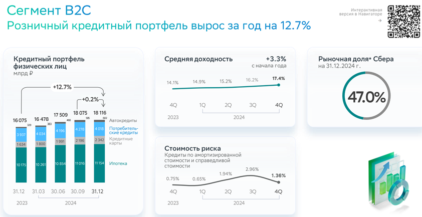 Розничный кредитный портфель составляет 18,1 трлн руб (+12,7%). Важно, что в 4 квартале прирост остановился совсем. Средняя доходность– 17,4%.