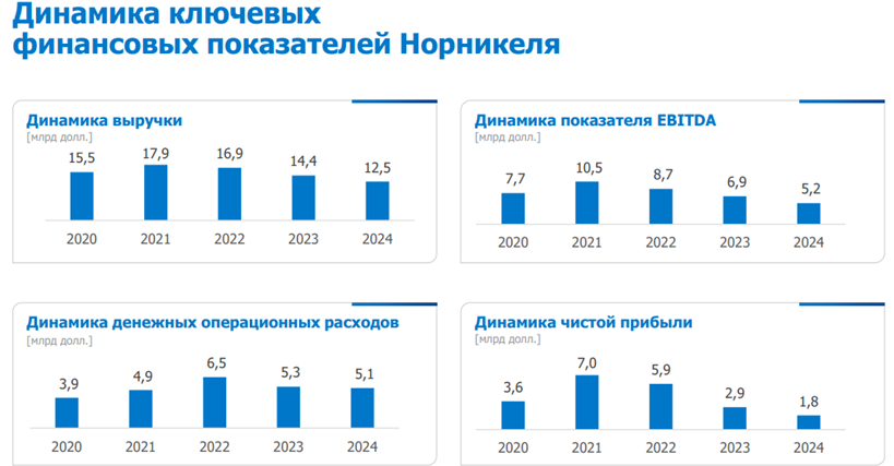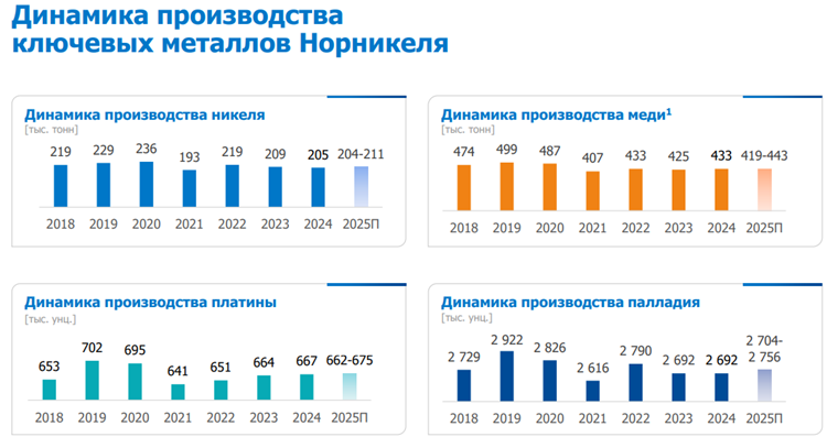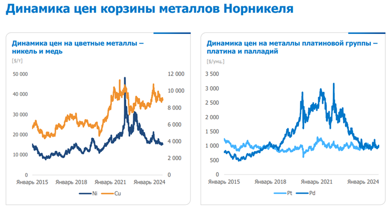 Рыночная конъюнктура по всем четырем базовым металлам компании (никель, медь, палладий, платина) — разнонаправленная. Взлет цен на никель и палладий в 2019–2022 годы позади, сейчас улучшается ситуация на рынке меди.