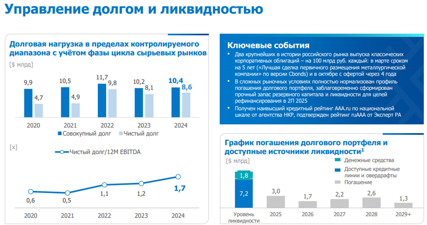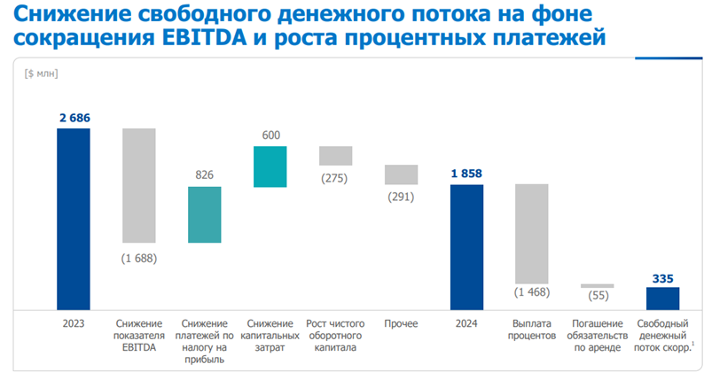 Свободный денежный поток формально положительный — 1,9 млрд $, но после корректировок на проценты (почти 1,5 млрд $) и аренду остается всего 335 млн $. В связи с тем, что FCF близок к нулю, менеджмент не рекомендует выплату дивидендов за 2024 год.