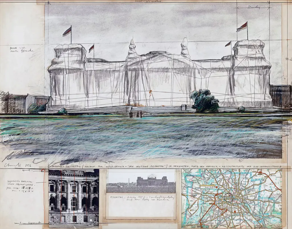 В начале 1960-х Кристо заворачивал небольшие объекты, что-то будничное, что попадалось под руку. А дальше проекты становились все более масштабными: в 1969-м они с Жанной-Клод обернули тканью и затянули веревки на здании Музея современного искусства в Чикаго (упаковали его как снаружи, так и внутри), в 1995-м завернули (как будто для хранения в архиве истории) здание Рейхстага, а в 2001-м скрыли под слоем ткани Триумфальную арку.