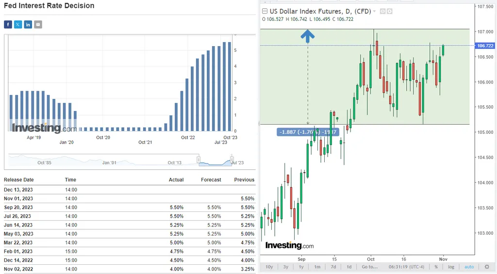 Как ожидается, ставка останется на прежнем уровне 5,50%. Инвесторы хотят услышать от Пауэлла его мнение относительно дальнейших планов ФРС на этот и уже следующий год, рассчитывая на еще одно повышение процентной ставки в декабре.