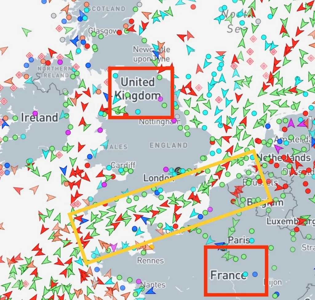 Вообще, если посмотреть на интенсивность движения кораблей в Ла-Манше, то она запредельная. Только представьте, за одни сутки, по Ла-Маншу проходит не менее 500 кораблей. А в некоторые дни и до 1000! Они идут из портов Франции, Великобритании, Германии, Нидерландов, Польши в сторону Северной и Южной Америки, и обратно. Одна из самых загруженных водных артерий в мире. Вот даже ночью, в момент написания статьи, открыв онлайн карту движения судов, видим, что они идут без остановки.