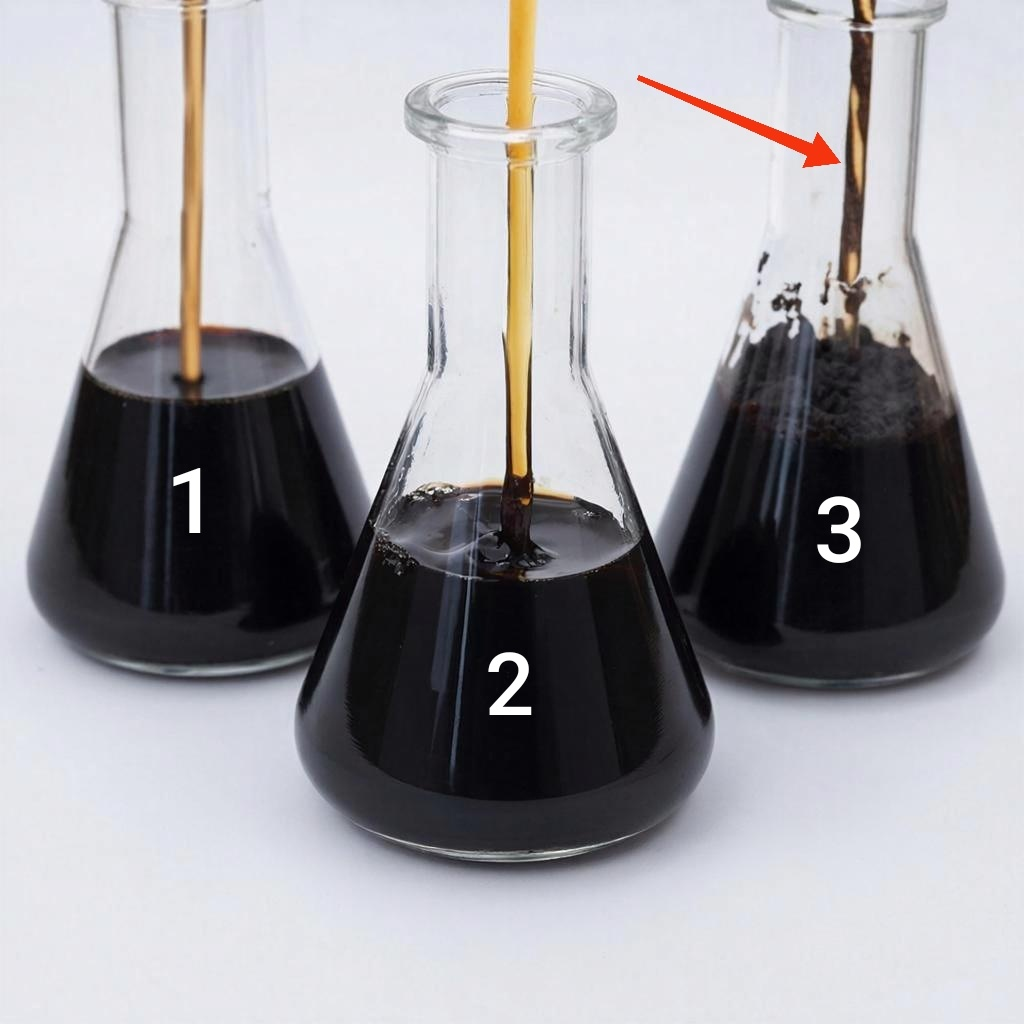 В первой колбе нефть низкой плотности. Почти как вода. И она легко пройдёт через соломинку.