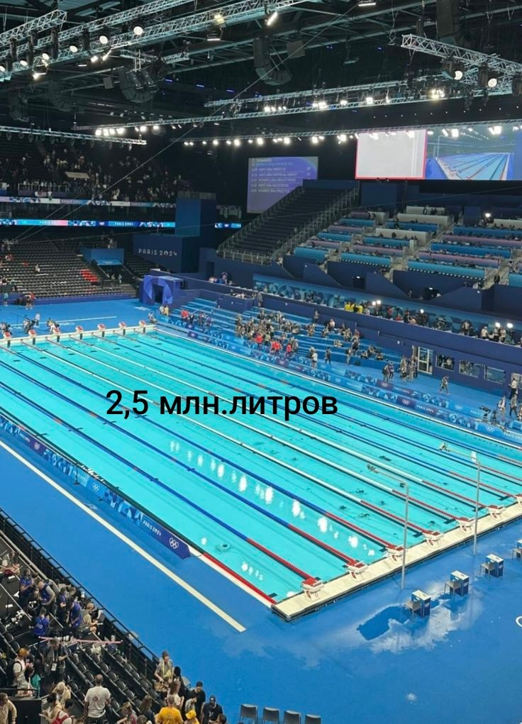 Как мы знаем, в одном кубометре 1000 литров. Соответственно 1000*2500 и получаем 2,5 миллиона литров воды в одном олимпийском бассейне.