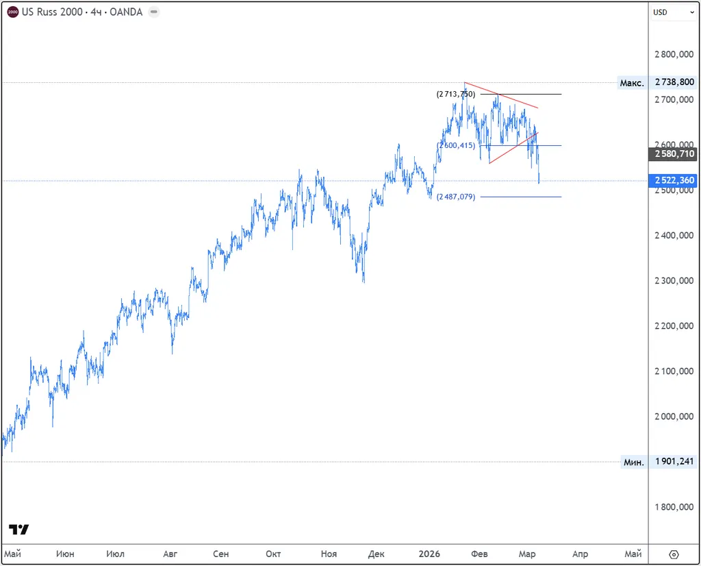 Более слабые компании из индекса Russell 2000 могут пострадать гораздо сильнее, поэтому у него шансов обвалиться побольше.