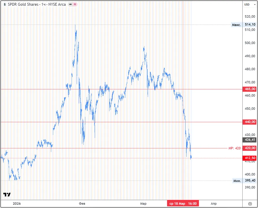 При условии, что не будет сильных внешних драйверов на цену золота со стороны новостного фона, наибольшая вероятность «парковки цены» к моменту экспирации — это уровень max pain, который на 14 марта находится в районе страйка 420.
