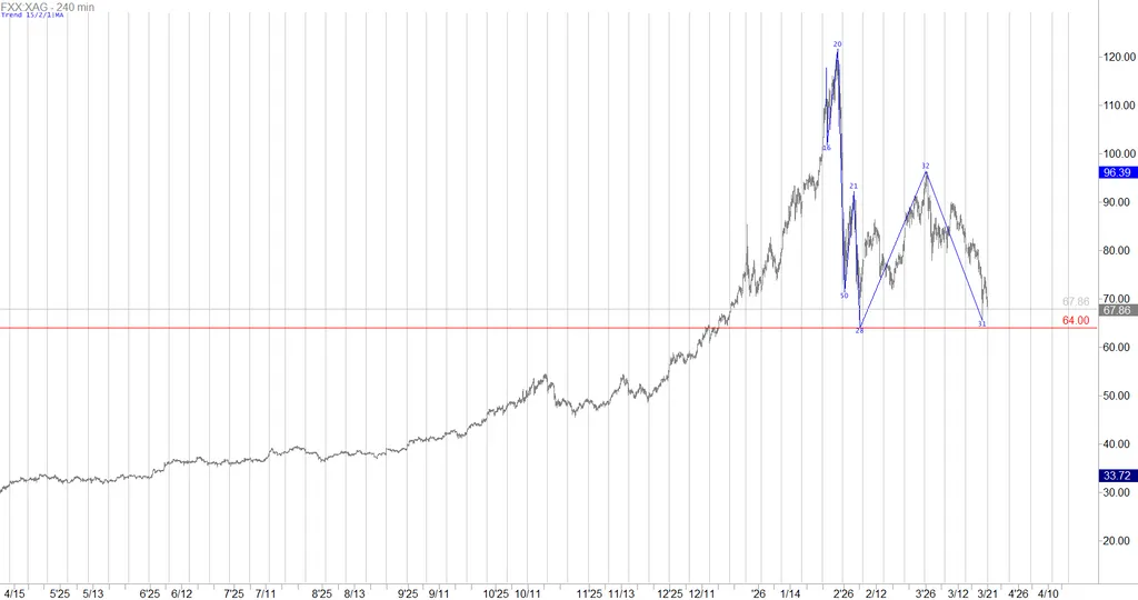 Серебро может пробить поддержку в районе 64 и повалиться к низам следом за золотом, которое может быть основным драйвером распродажи драгметаллов.