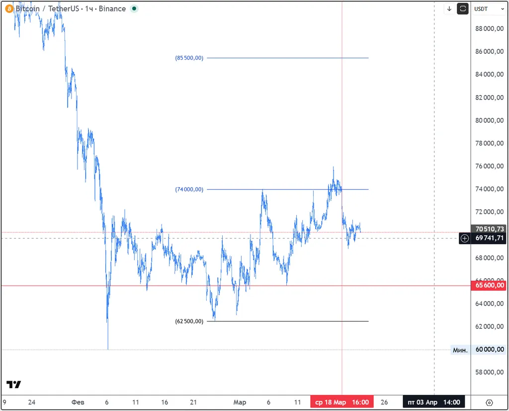 Формально восходящий тренд не сломлен, пока не выбили 65600. Но мне видится, что биткоин может снова завалиться в диапазон 62500-72000 с хаотичной болтанкой.