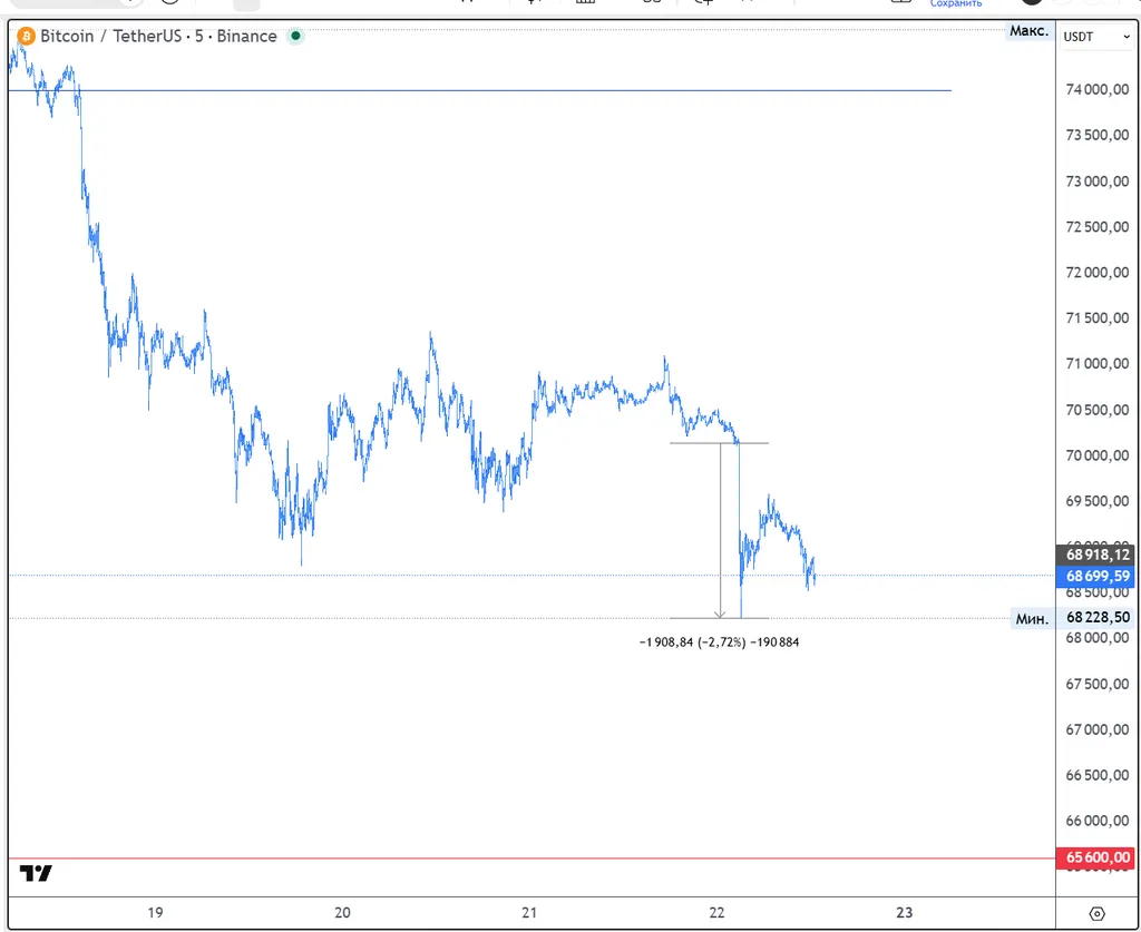 Падение цены биткоина этой ночью более чем на 2,5% и пробой психологической отметки в 69000 были вызваны внезапным обострением геополитической обстановки на Ближнем Востоке.