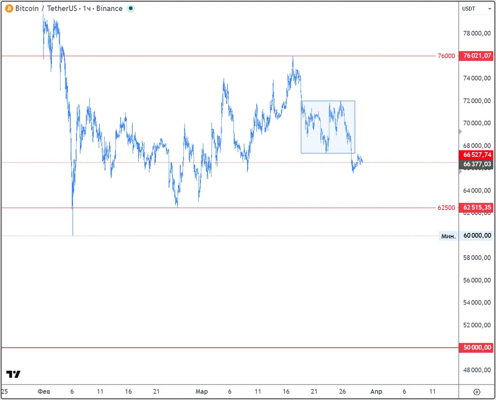 Потоптались неделю в диапазоне и выбили его вниз. Биткоин начинает следовать за индексами и новостным фоном, но цена находится в центре «мёртвой зоны». Война с Ираном будет идти по сценарию эскалации — индексы и биткоин будут падать. Начнут переговоры, взлетят.