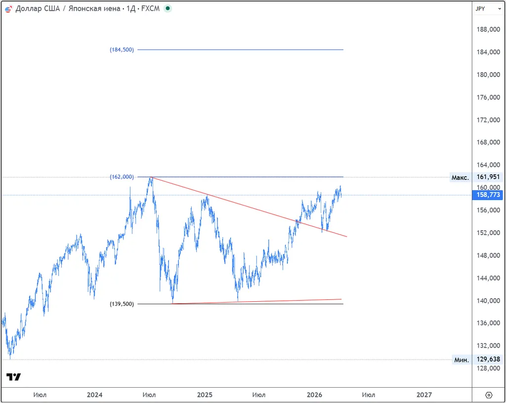 Иена — откат может быть в рамках модели продолжения долгосрочного восходящего тренда. Посмотрим, будет ли подбор при подходе в район 157.60.