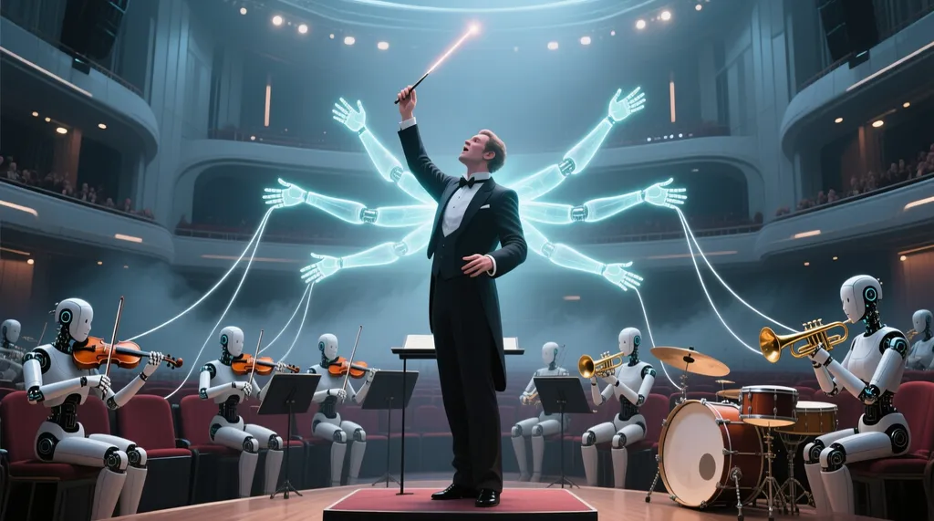 Тем не менее, это ещё не само творчество. Это один из его инструментовв. Творчество предполагает озарение, которое всегда приходит из глубин осознанности. Так что у нас с Квеном был один источник озарения на двоих. На рисунке выше, созданном Квеном по моему сценарию, вы можете увидеть иллюстрацию моих представлений о творчестве. В центре творческого акта всегда находится человек: осознающий себя. Окружающие его голубые полупрозрачные руки — это и есть искусственный интеллект, программы 5 поколения. Они управляют умными роботами, механизмами.