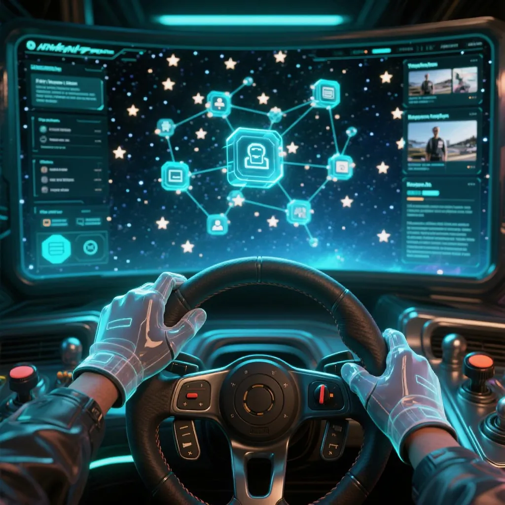 · «Пользователь в космическом шлеме взаимодействует с виртуальным рулём, вокруг него плавают иконки данных. Цифровой арт, яркие акценты».