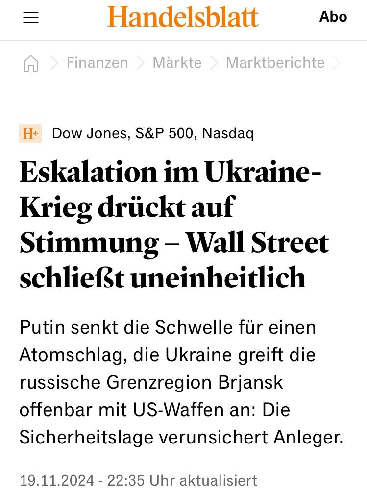 🇩🇪🇺🇸🇷🇺🇺🇦Немецкое деловое издание Handelsblatt пишет, что индекс Доу Джонса рухнул на 350 пунктов после удара американскими ракетами по Брянской области. То же касается и Nasdaq.