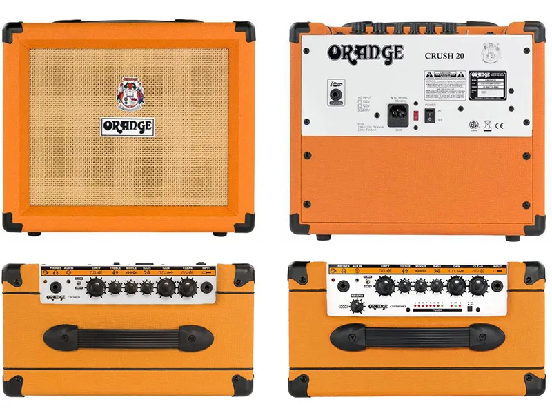 Гитарные усилители Orange — ещё одна британская легенда. При своём чопорном внешнем виде, усилители отличаются грязным прифуззованным хулиганским звучанием дисторшна с большим запасом гейна, и кристальным чистым клином. Для начинающих гитаристов Orange предлагает 20-ваттный восьмидюймовый домашний комбик Crush 20 в закрытом корпусе, или его версию с ревером и встроенным тюнером Crush 20RT. Оба комбика — двухканальные, канал перегруза имеет отдельные регулировки гейна и громкости. Запаса гейна хватит для любого тяжеляка. Переключение каналов может осуществляться не только кнопкой, но и педальным футсвитчем. Эквалайзер — трёхполосный, общий на оба канала. Имеются аукс на миниджеке для подключения внешнего источника фонограммы и выход на большом ¼» джеке наушники, причём кабинетулированный, то есть имитирующий звучание динамика. Очень радуют весёлые пиктограмки вместо подписей к гнёздам, кнопкам, регуляторам и лампочкам.