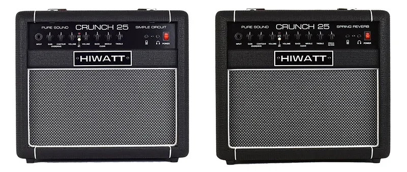 Hiwatt Crunch 25 — недорогой двухканальный транзисторный комбик, с жирным и тёплым чистым звуком, и весьма специфическим олдскульным прифузованным грязным овердрайвом, переносящим вас прямиком в семидесятые. Эдакая машина времени, не в смысле музыкальной группы, а в смысле средства перемещения. Эквализация у чистого и грязного каналов раздельная, на клине это привычный трёхполосный эквалайзер, а на овердрайве — ручка Contour, вырезающая середину. Регулировки гейна и громкости канала овердрайв — раздельные, для переключения каналов предусмотрен футсвитч. Имеется выход на дополнительный кабинет, аукс для внешнего источника фонограммы и выход на наушники. Оба на миниджеках. Конструкция кабинета — открытая. Оригинальный динамик — четырёхомный. Производится также версия с пружинным ревером на борту.