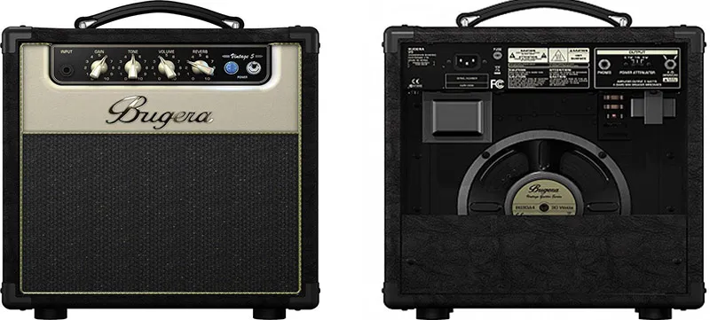 Ламповый гитарный комбик Bugera V5 Infinium многие считают клоном Matchless SC Mini, однако это ошибочное мнение, из общего у них только внешний вид. V5 Infinium — это собственная разработка Bugera. Комбик очень прост, но отлично дружит с гитарными педалями. Мощность — 5 Ватт. Собственное звучание носит британский характер аля вокс. В отличие от большинства других ламповых комбиков в этом ценовом классе, Bugera V5 Infinium достаточно наворочен. Тут есть независимые регулировки гейна и громкости, регулятор тембра, ревер. Правда ревер цифровой, но работающий параллельно, основной тракт сигнала полностью ламповый. Также есть аттенюатор, позволяющий заставить звучать комбик очень тихо, на домашней громкости. Есть и выходы на внешний кабинет и на наушники, причём не с преампа, а с оконечника. Динамик — восьмидюймовый Turbosound, но четырёхомный, имейте в виду, если решитесь на замену. Хотя можно вполне довольствоваться и им. Ещё одно интересное решение — лампочка, вроде Check Engine, сигнализирующая, когда пришло время менять лампы.