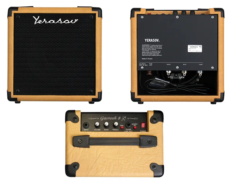 Yerasov Gavrosh 8 — ламповый гитарный комбик, заточенный под домашние занятия. Производитель позиционирует его как аппарат, для домашних упражнений на чистом звуке или с примочками. В каком-то смысле этот комбик можно назвать — антифендер. Если Лео Фендер добавил своим усилителям ручку Presence, добавляющую яркости то Ерасов установил фильтр, подрезающий лишний песочек от примочек овердрайва-дисторшна. Темброблок имеет регулировку ВЧ и НЧ. Ещё одна фишка Гавроша — пассивная нагрузка, позволяющая играть в тишине в наушники, не отключая оконечника, гася сигнал, предназначенный динамику через нагрузочный резистор. Вы не обходите оконечник, позволяя полноценно использовать его и в наушниках. Производитель предлагает на выбор комплектацию восьмидюймовым гитарным динамиком Celestion или Jensen и цветом обивки на вкус заказчика.