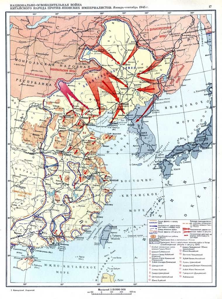 Китайцы, кстати, воевали упорно и достаточно умело, многие города несколько раз переходили из рук в руки, как у нас — Харьков (по накалу борьбы и воле к победе Китай с какой-нибудь Францией — не сравнить). Ближе к концу, когда мобилизационный потенциал территорий, остававшихся под контролем официального правительства Чан Кайши, сократился до критического уровня, стали формироваться даже чисто женские пехотные части. В СССР, к примеру, до этого не дошло (хотя планы такие существовали — мужчинами в таких частях должны были быть только заряжающие тяжёлых орудий; но после победы под Москвой в этом уже не было нужды). И Китаю удалось удержать свою часть общего фронта Союзников: японская армия не смогла полностью захватить Китай и использовать его как основу для дальнейшей экспансии (против СССР, в частности).