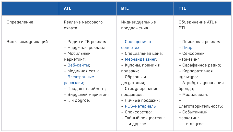 У маркетологов богатый арсенал средств маркетинговой коммуникации. Традиционно они разделяются на ATL (Above the line — над чертой) и BTL (Bellow the line — под чертой). Но развитие технологий привело к появлению еще одной группы инструментов — TTL (Total the line — посередине).