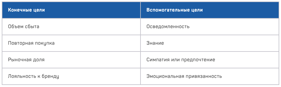 Пример вспомогательной цели: добиться осведомленности о новой зубной пасте у 90% стоматологов в течение месяца с момента выведения этой пасты на рынок. Конечной целью может быть достижение объёма сбыта новой зубной пасты в количестве 300 тыс. штук.
