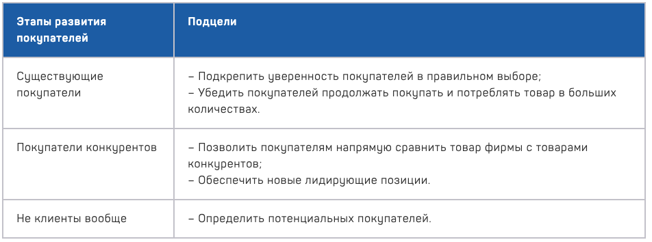Когда на первом этапе оценки ситуации Вы ответили на вопросы, это было не просто ради забавы. Ведь по результату Вы создали группы клиентов. И Вам нужно на каждую группу сделать свою цель. Всё-таки имеет значение, делаете Вы это для действующих клиентов или для клиентов конкурентов. Но это в идеале.