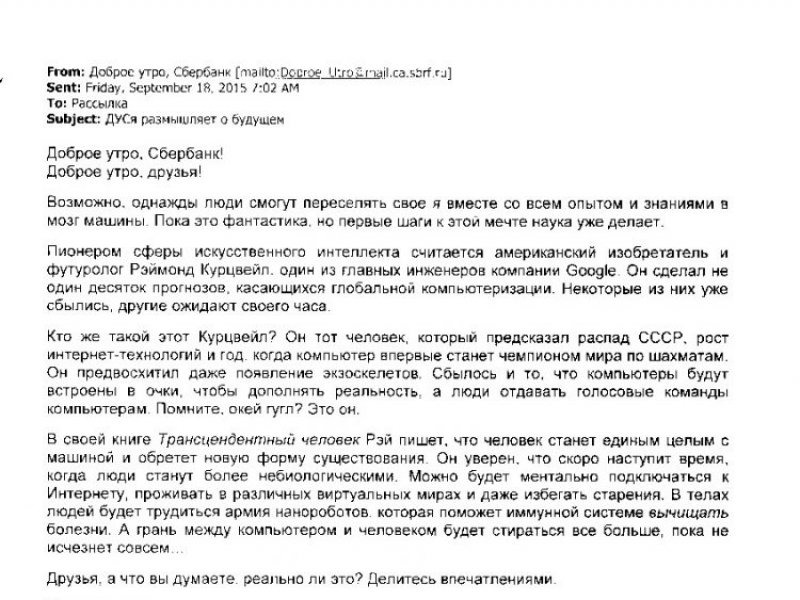 Рассылка «Доброе утро, Сбербанк», выходила в виде текстового сообщения (письма) размером не более 3000 знаков. По плану такая рассылка должна была просматриваться за пару минут и не мешать работе. В письмах рассказывались небольшие истории, из которых сотрудники знакомились с историями своих коллег или клиентов, получали житейские советы на каждый день, узнавали информацию о деятельности «Сбербанка» и рыночные тренды.
