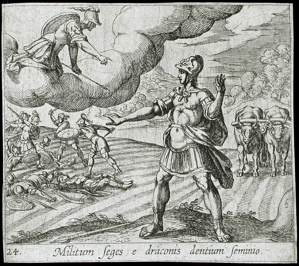 После того, как по наущению Медеи, дочери царя, он бросает средь появившихся из земли воинов валун, они завязывают друг с другом бой и погибают.