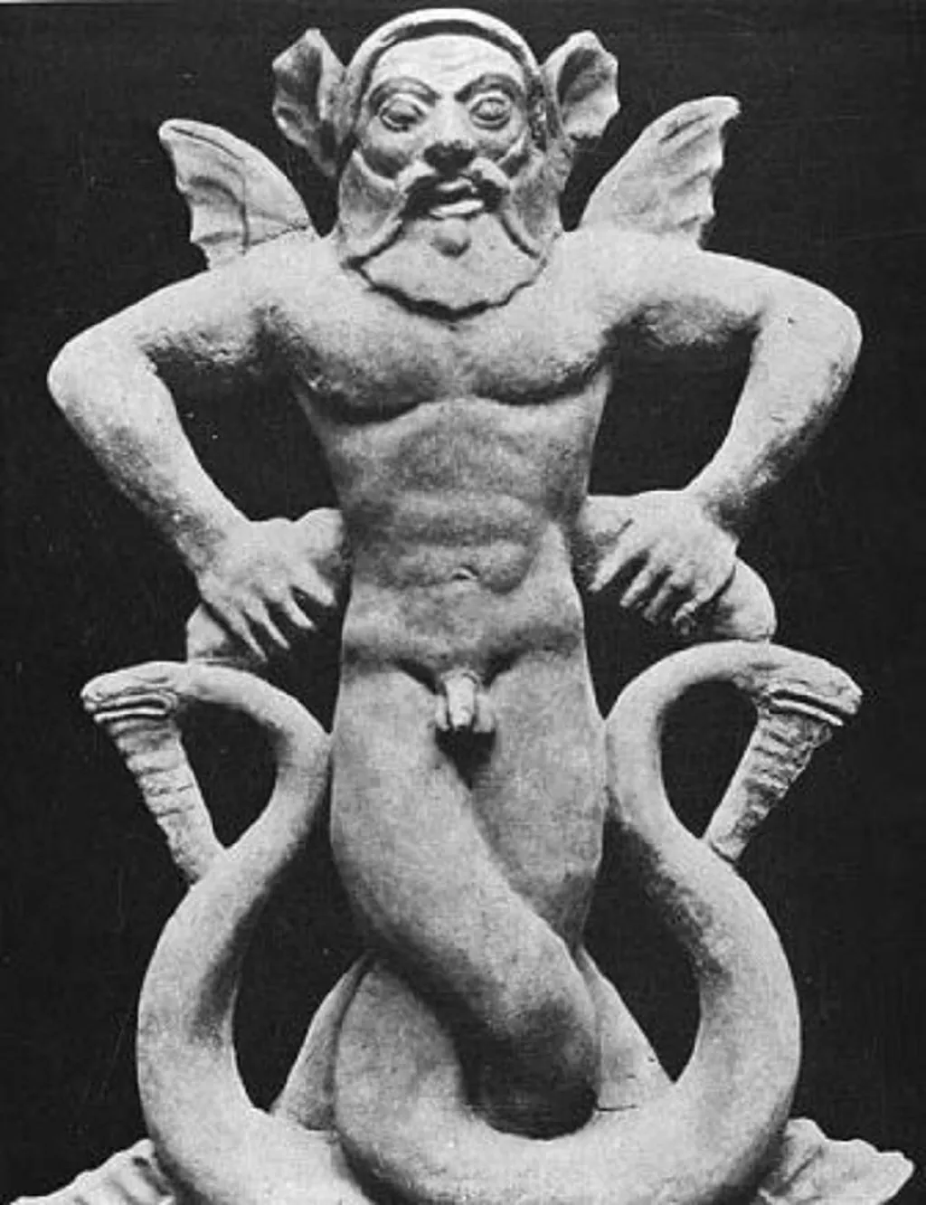 Ещё один символ змееногости мы встречаем в образе ужасного Тифона, которого, так же как титанов и гигантов, побеждает великий Зевс. Эта параллель, как и те же змеиные хвосты вместо ног в изображениях гигантов, явно указывает на один и тот же смысл этих образов.