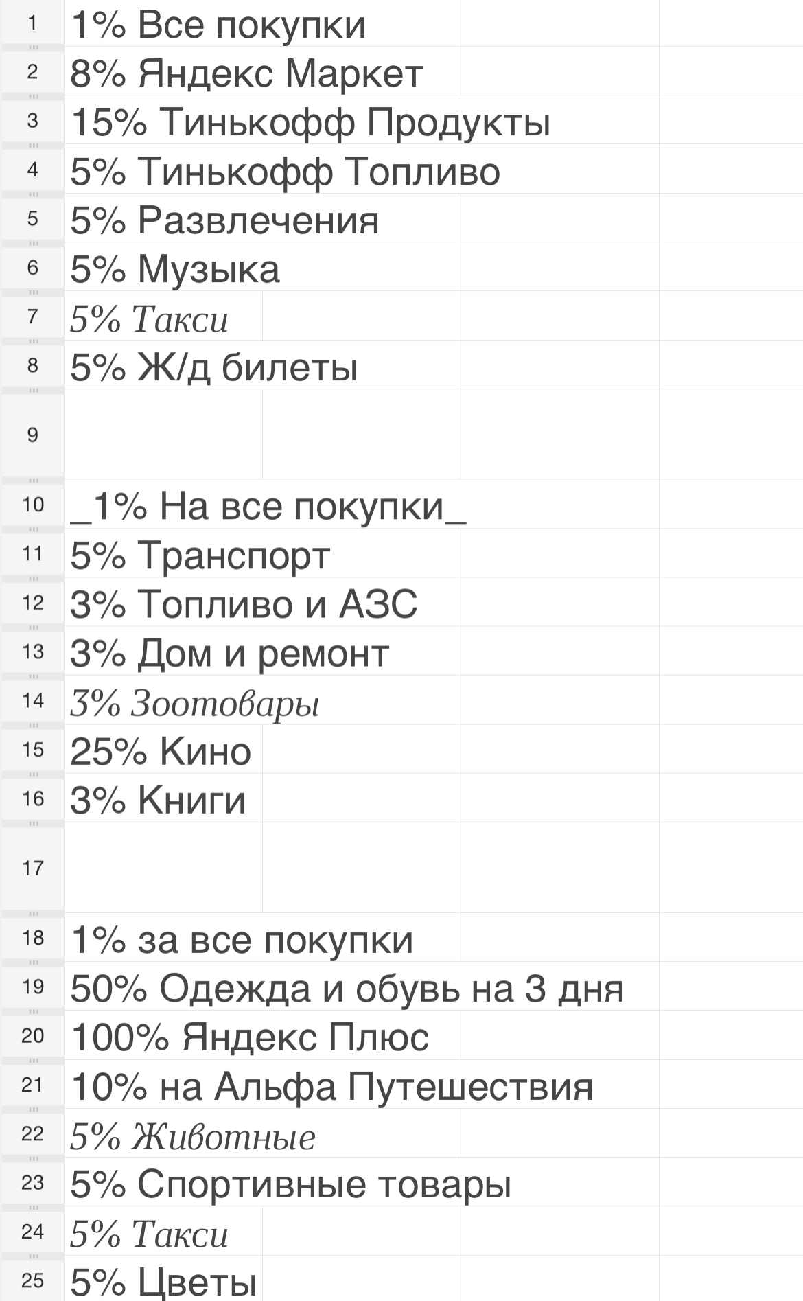 Хотя некоторые банки предоставляют возможность выбора категорий кешбэка уже с 25 числа текущего месяца, лучше не спешить и подождать, когда эта информация появится у других банков. Так можно будет выбрать разные категории и в идеале они будут все уникальные ? (на скриншоте пример на август и только две повторяющиеся категории)