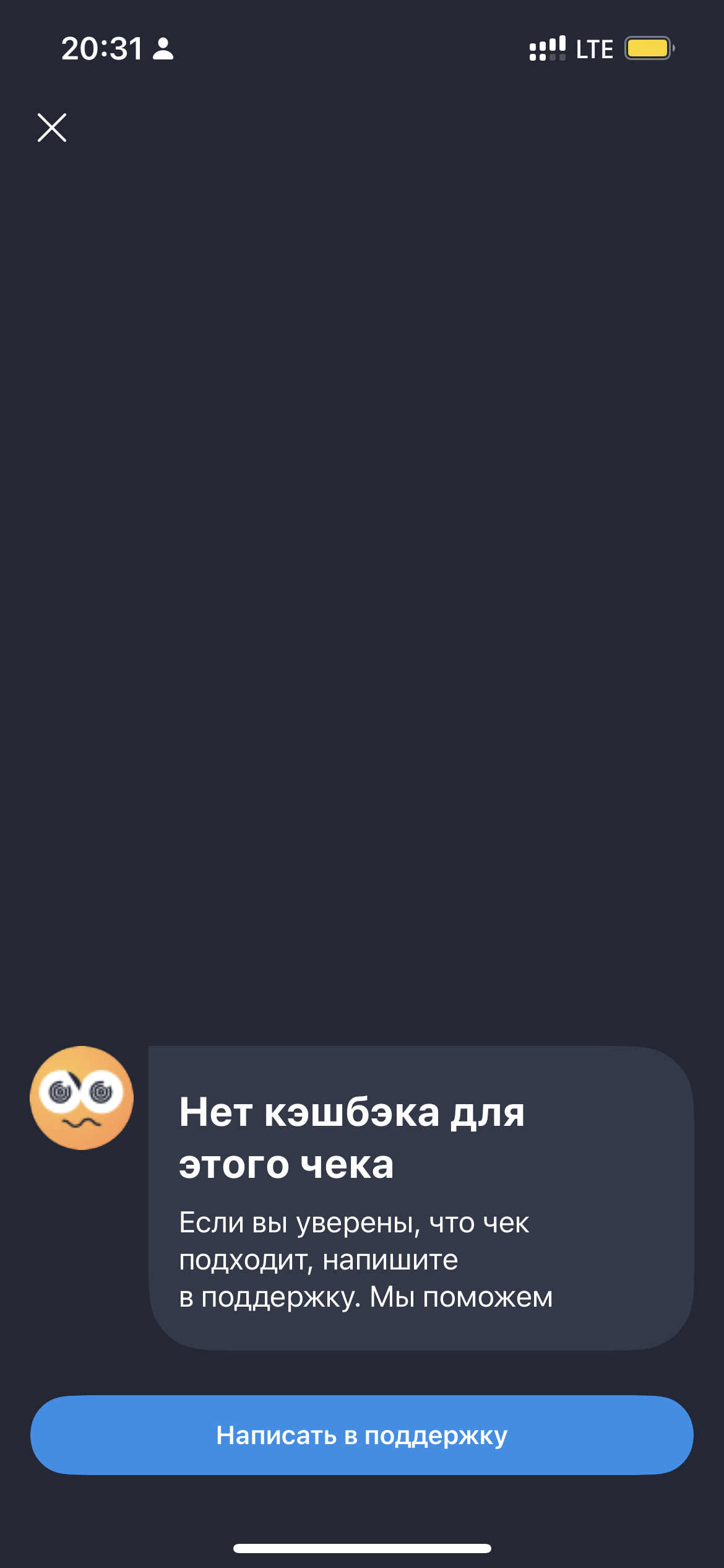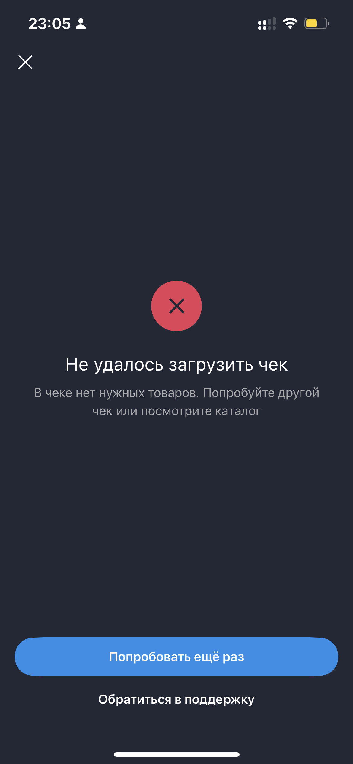 В качестве альтернативного хранилища ваших чеков (вы же ведёте учёт расходов? 🙃) приложение не подходит. До недавнего времени, не найдя в чеке товар по которому можно начислить кешбэк, приложение выдавало грозное сообщение (скриншот #1). Потом сообщение поменяли на более нейтральное (скриншот #2). Делаем вывод, что перед отправкой чека (следующий уровень перед покупкой 🧐) нужно свериться со списком товаров в приложении и если уверены что такие товары в чеке есть, отправить и получить кешбэк.