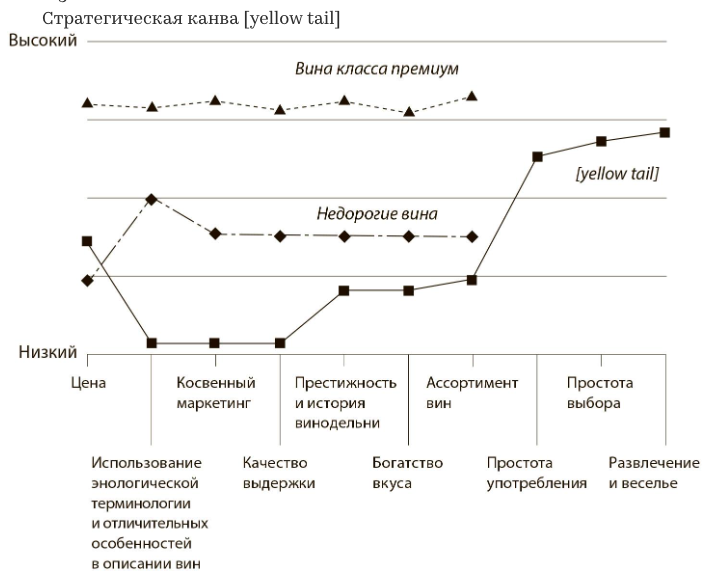 Так, например, Casella Wines создала «голубой океан» на переполненном рынке вина США, перестав играть по правилам традиционных винных брендов. Вместо конкуренции в «элитарности» (терруар, медали, сложные описания, винная терминология, узкая сегментация) компания сформулировала стоявшую перед ней задачу иначе: создать дружелюбное нетрадиционное вино для широкой аудитории.