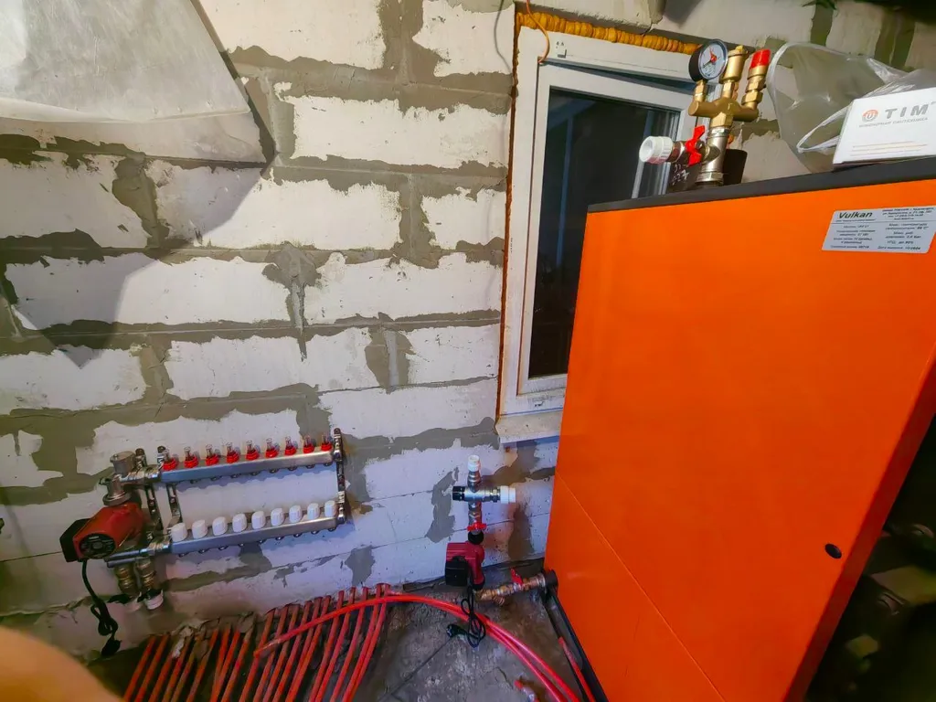 Удалось закупить брикетов которых надеюсь хватит до ввода котла в эксплуатацию. Полностью спаял трубы по второму этажу, вывел через перекрытие на первый. Собрал коллектор теплого пола, установил группу безопасности на котёл, фильтр, насосы. По пять раз в день мотался в магазин докупая нехватающее и меняя и сдавая лишнее. Всё делаю в первый раз и потому кучу раз спотыкаюсь. Тщательно всё перемотано паклей с сантехнической пастой. Сегодня планирую завести в коллектор трубы тёплого пола. Для этого даже купил фиксаторы углов поворота, чтобы не поломать трубы. Для наполнения системы после окончания обвязки, по подсказке доброго друга, будем использовать этиленгликоль с дистиллированной водой. Выйдет в разы дешевле чем покупной теплоноситель. Надеюсь системе это никак не навредит.