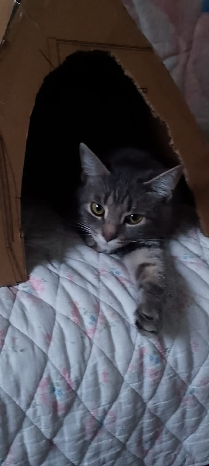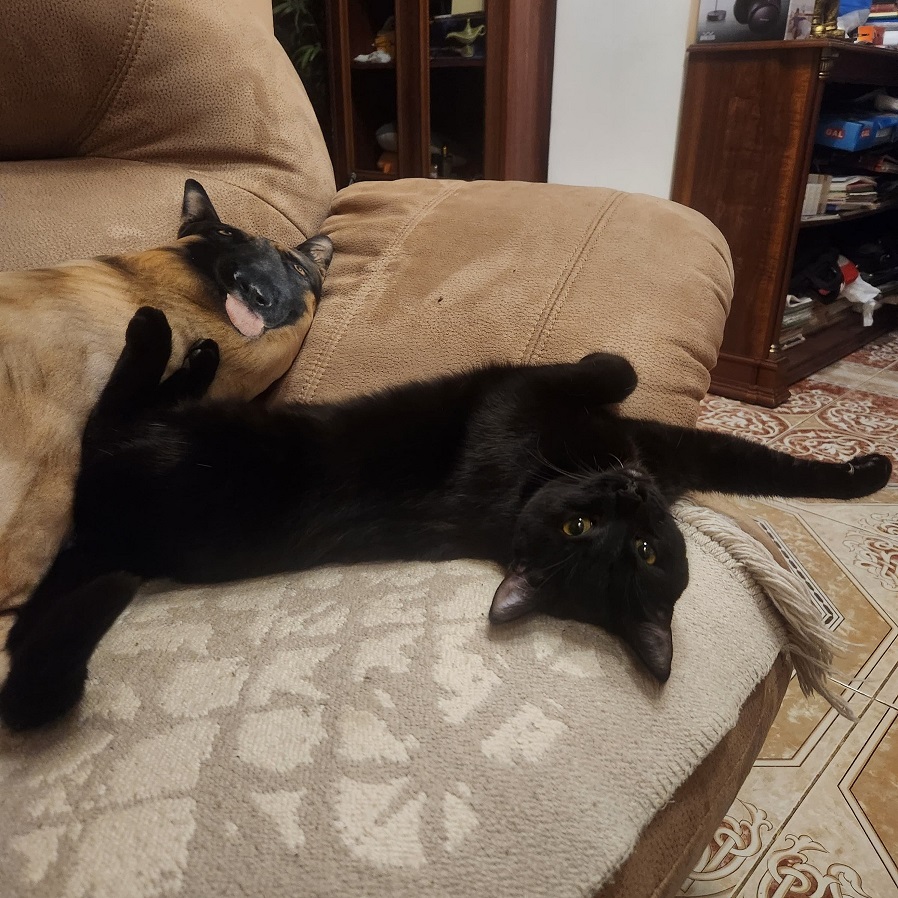 Новенькие кошечки на передержке очень пугливые. Судя по возрасту это мать и дочь. Так определил ветеринар. Эней на передержке первые два дня ходил в лоток, а сейчас в нём спит, а гадит рядом. Странный парень. Надеюсь переучится.