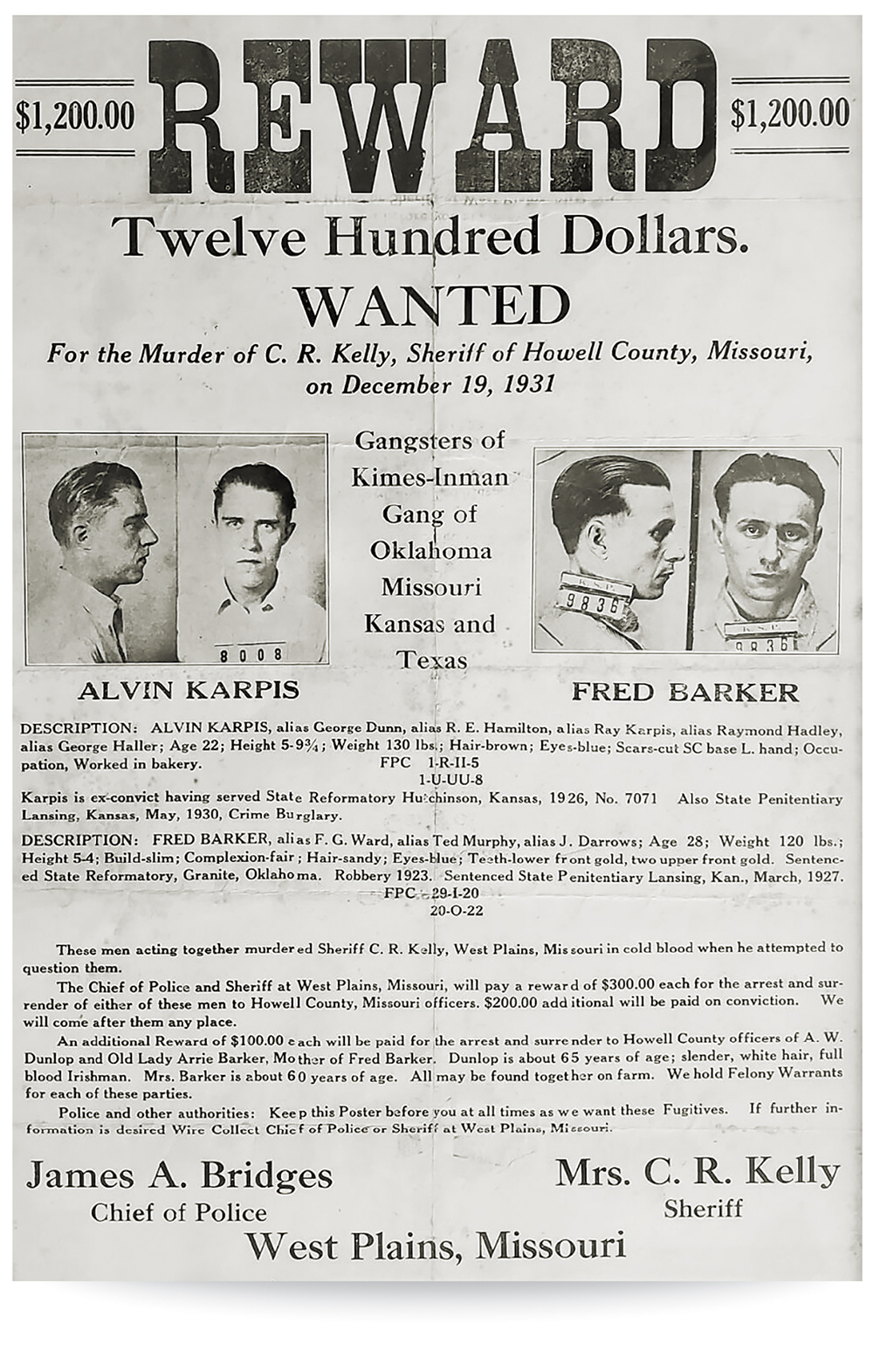 Фред и Элвин ограбили магазин, но попали в поле зрения местного шерифа С. Роя Келли. Шериф был человеком дотошным и заметил подозрительный автомобиль — синий DeSoto — в местном гараже. Когда он подошёл задать пару вопросов, ответом ему стали четыре выстрела в упор. Шериф Келли погиб на месте, а бандиты, прихватив Мамашу и её тогдашнего сожителя, алкоголика Артура Данлопа, рванули в бега. Убийство служителя закона — это чёрная метка. Оставаться на Юге, где все законники округи теперь охотились на них, было нельзя.