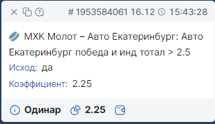 Как итог, сегодня основным вариантом предлагаю считать: Авто не проиграет и индивидуальный ТОТАЛ 2.5 больше. Контора на этот исход предлагает КФ 2.25