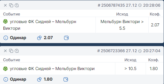 Я не буду пытаться тут ловить ОЗ+ТБ, хотя это кажется вполне очевидным. Сидней в принципе меньше двух дома не забивает, а Мельбурн как не крути не аутсайдер и свой один тоже должны класть. Но глядя на лички, такой исход меня отталкивает. Не будем выдумывать, будем ловиться Контору на углах.