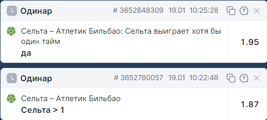 И как вариант Сельта выиграет один из таймов, КФ 1.97