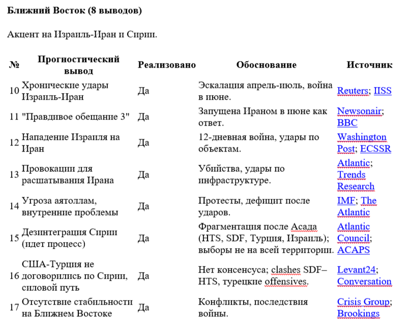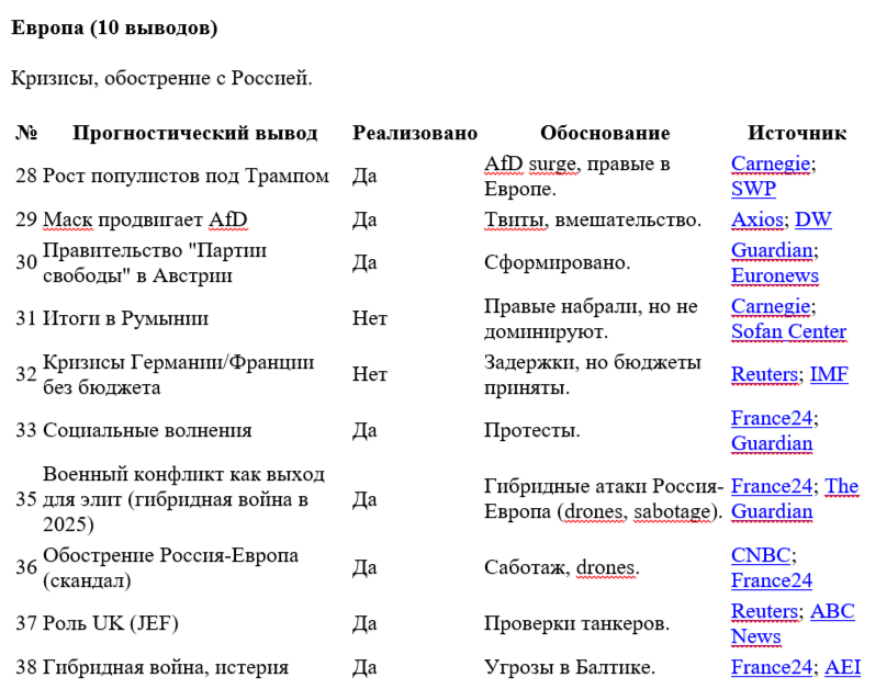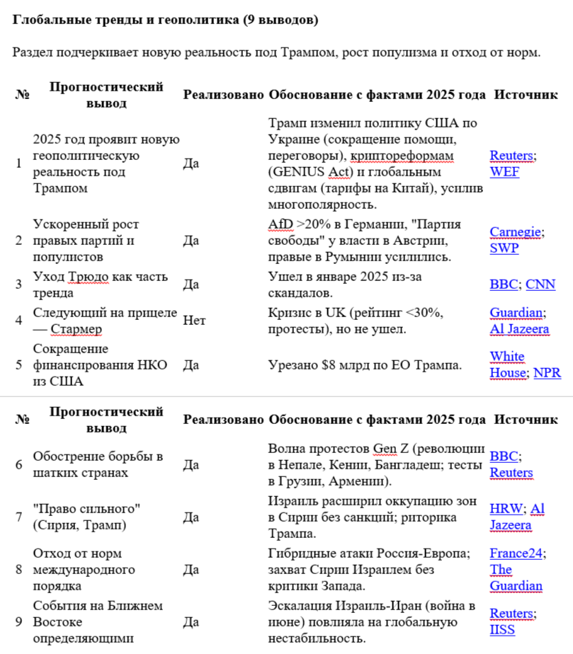 Анализ 52 прогностических выводов показывает, что прогноз Ладогина в целом точен: реализация 89% отражает сильные тенденции в геополитике (популизм, «право сильного», протесты Gen Z) и конфликтах (Израиль-Иран, гибридная война Россия-Европа). Несбывшиеся минимальны (11%), в основном в персоналиях и экономических нюансах. Учитывая дату (декабрь 2025), некоторые аспекты могут развиваться дальше. Прогноз ценен для понимания циклов, но субъективен в рисках — реальность показала больше дипломатии (переговоры) и меньше хаоса.