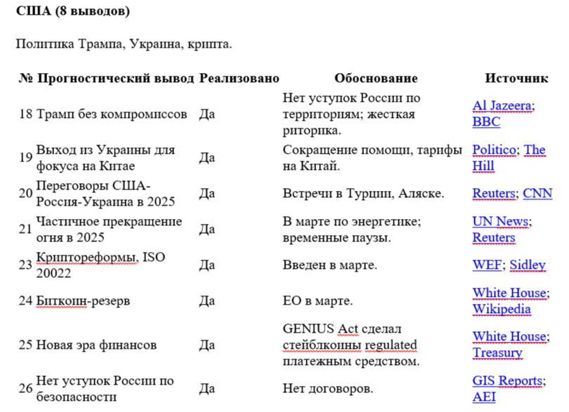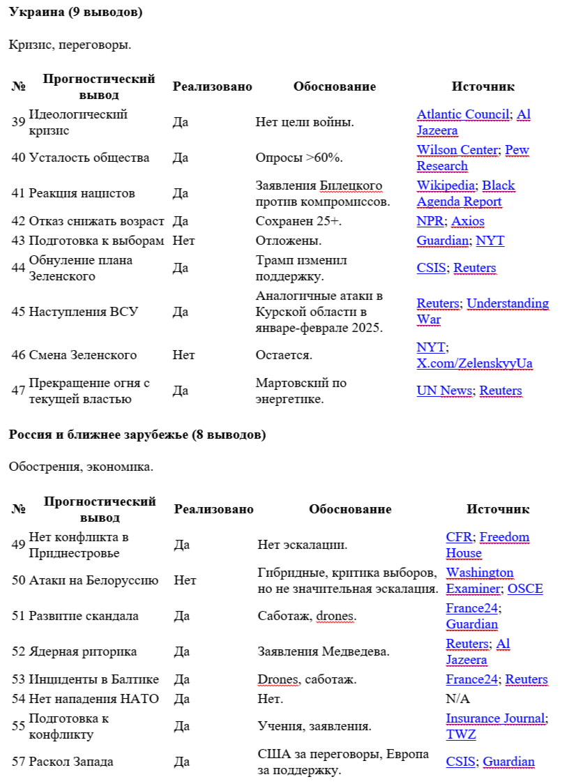 Нумерация в таблицах доходит до 57, нумерация включает пропуски для исключенных пунктов (22, 27, 34, 48, 56 — всего 5), а фактическое количество выделенных выводов в таблицах составляет 52. Пропуски были сделаны для описательных элементов (например, 27 — логика поведения Трампа по разрыву Россия-Китай, 56 — отсутствие победы в СВО в 2025) и пунктов в процессе (например, 22 — завершение в 2026). Таким образом, общее количество анализируемых выводов — 52, а не 57.