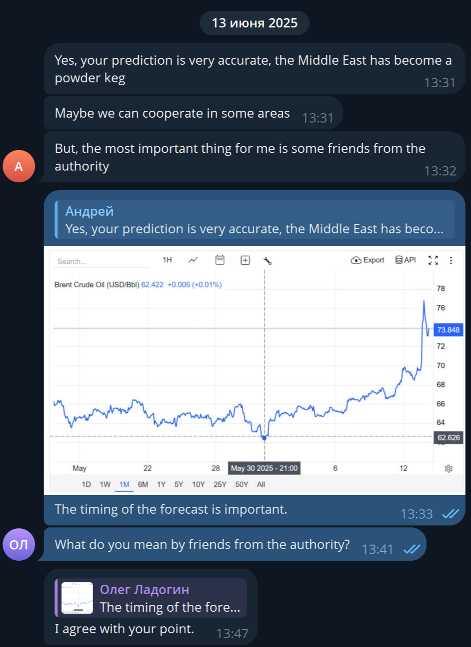 Диалог с работодателем шел на английском в Телеграмме. Его удовлетворила моя квалификация, исходя из прогноза о конфликте между Израилем и Ираном, который реализовался. Однако смущало, что он уж очень интересуется прежним местом работы, хотя оно было указано в резюме, а также наличием у меня «друзей» в администрации президента или Министерстве иностранных дел.